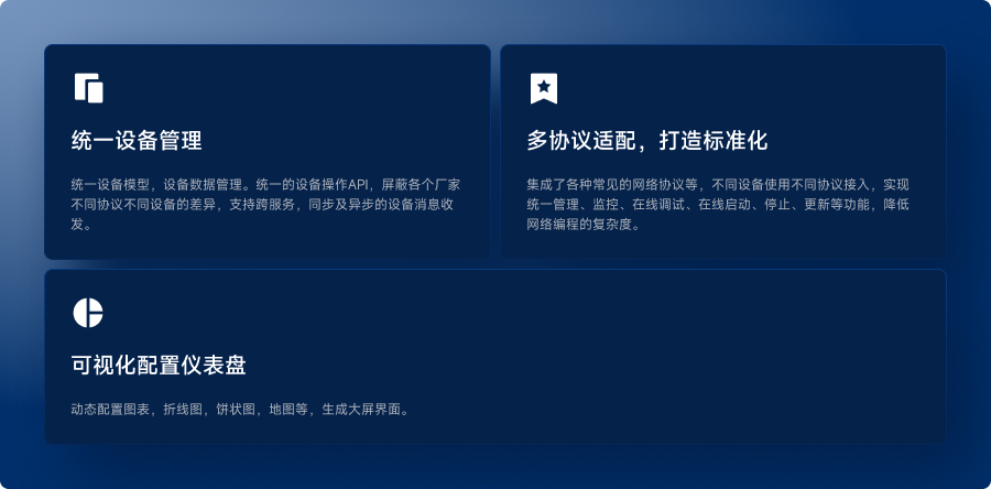 平臺提供各種物聯網協議的適配,可實現現場設備、儀表、傳感器等數據采集以及遠程控制,通過規則引擎將數據轉發到數據中臺,并對外提供物聯數據服務,實現對物聯設備的實時感知,以及進而觸發相應的告警分析、預警分析等智能分析服務。